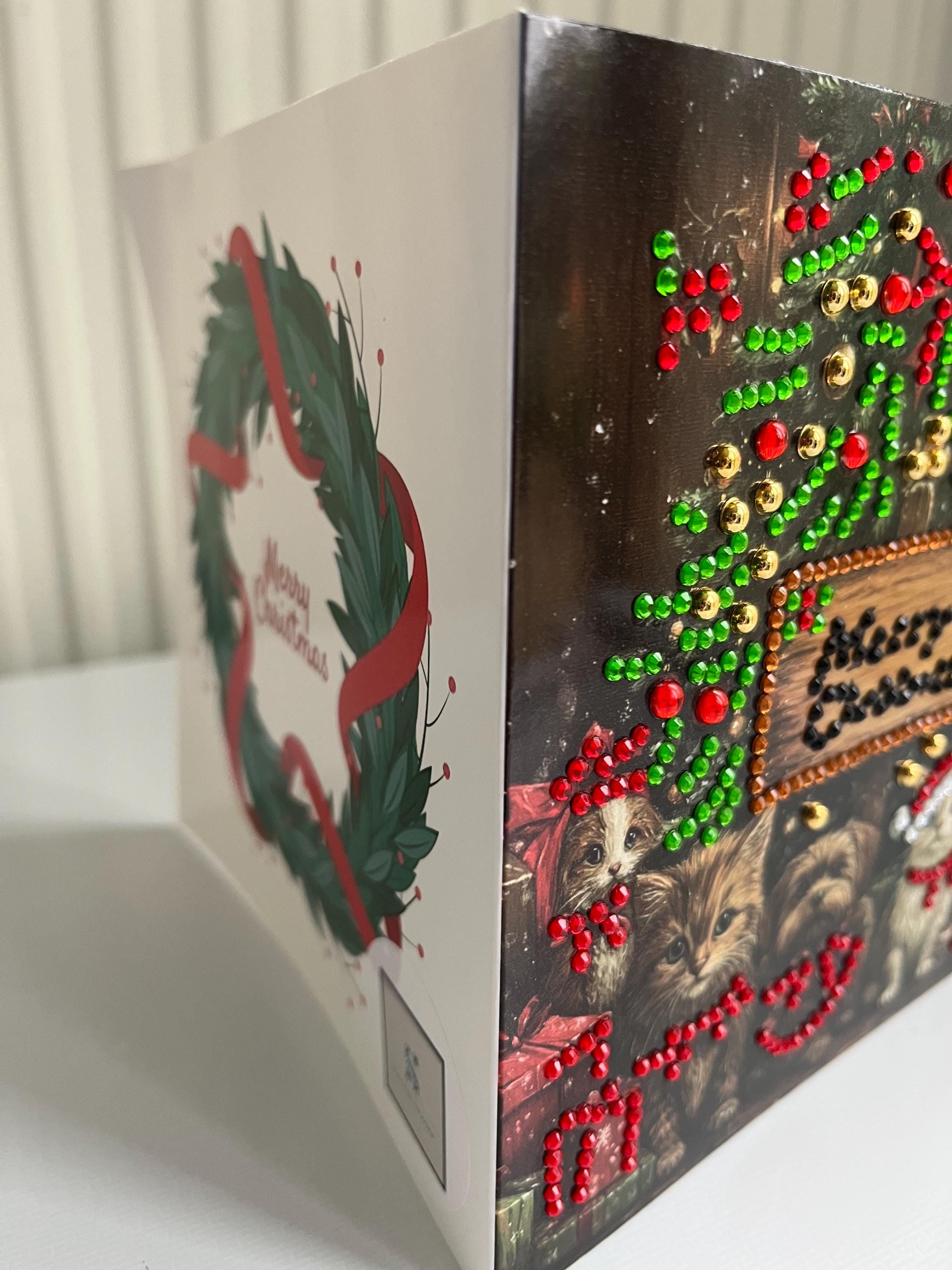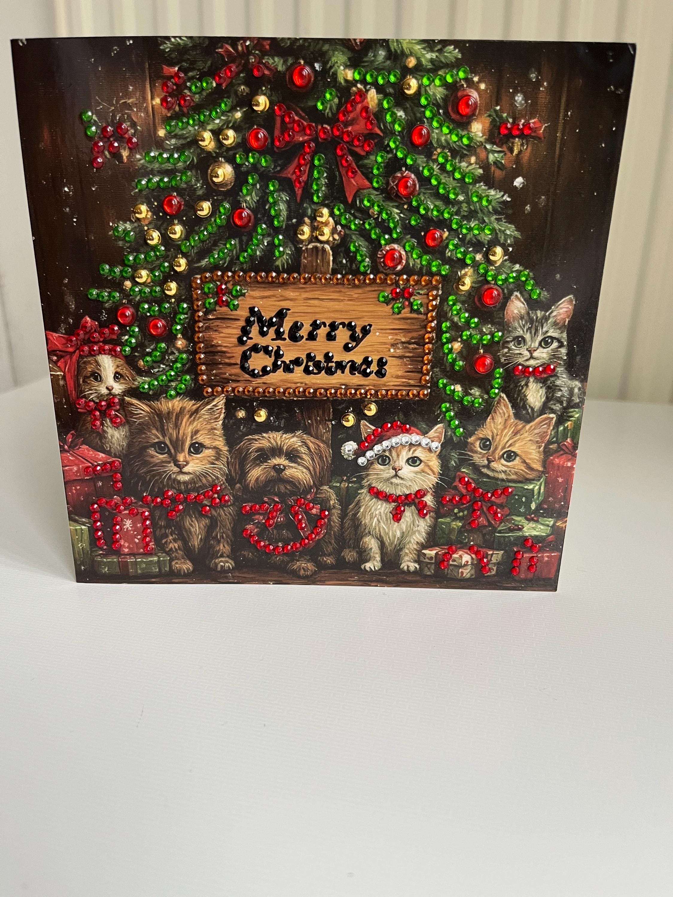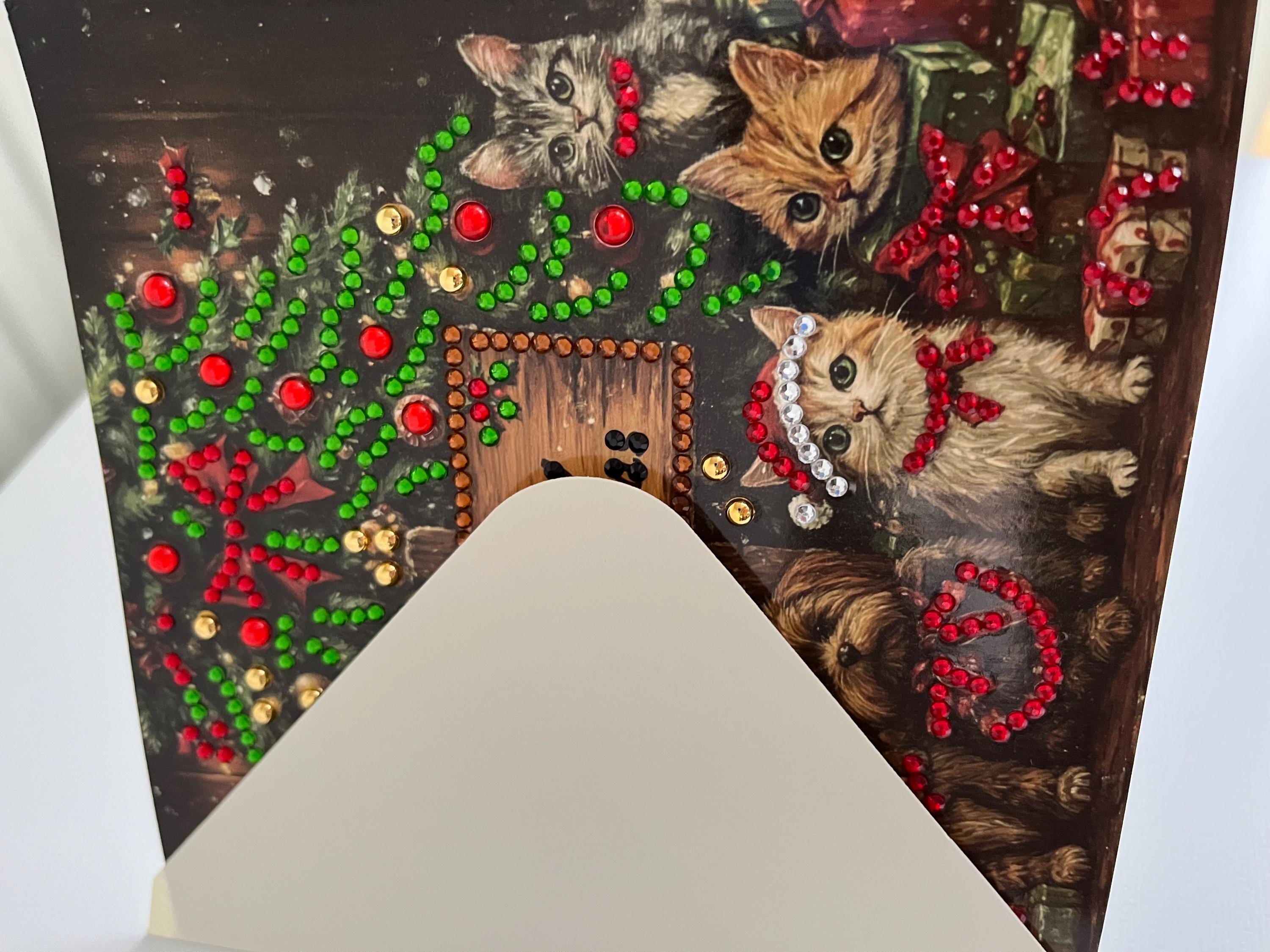 Celebrate the magic of the season with this whimsical, handcrafted crystal card featuring an adorable scene of festive felines! Each card showcases a sparkling Christmas tree surrounded by playful cats wearing tiny Santa hats, brought to life with hand-placed crystals that shimmer in the light.