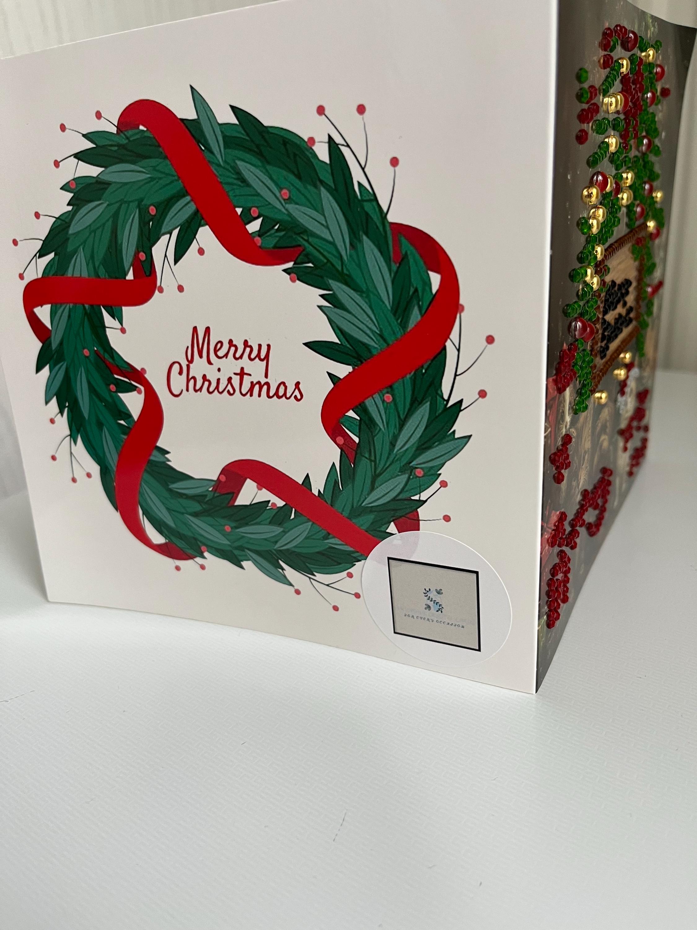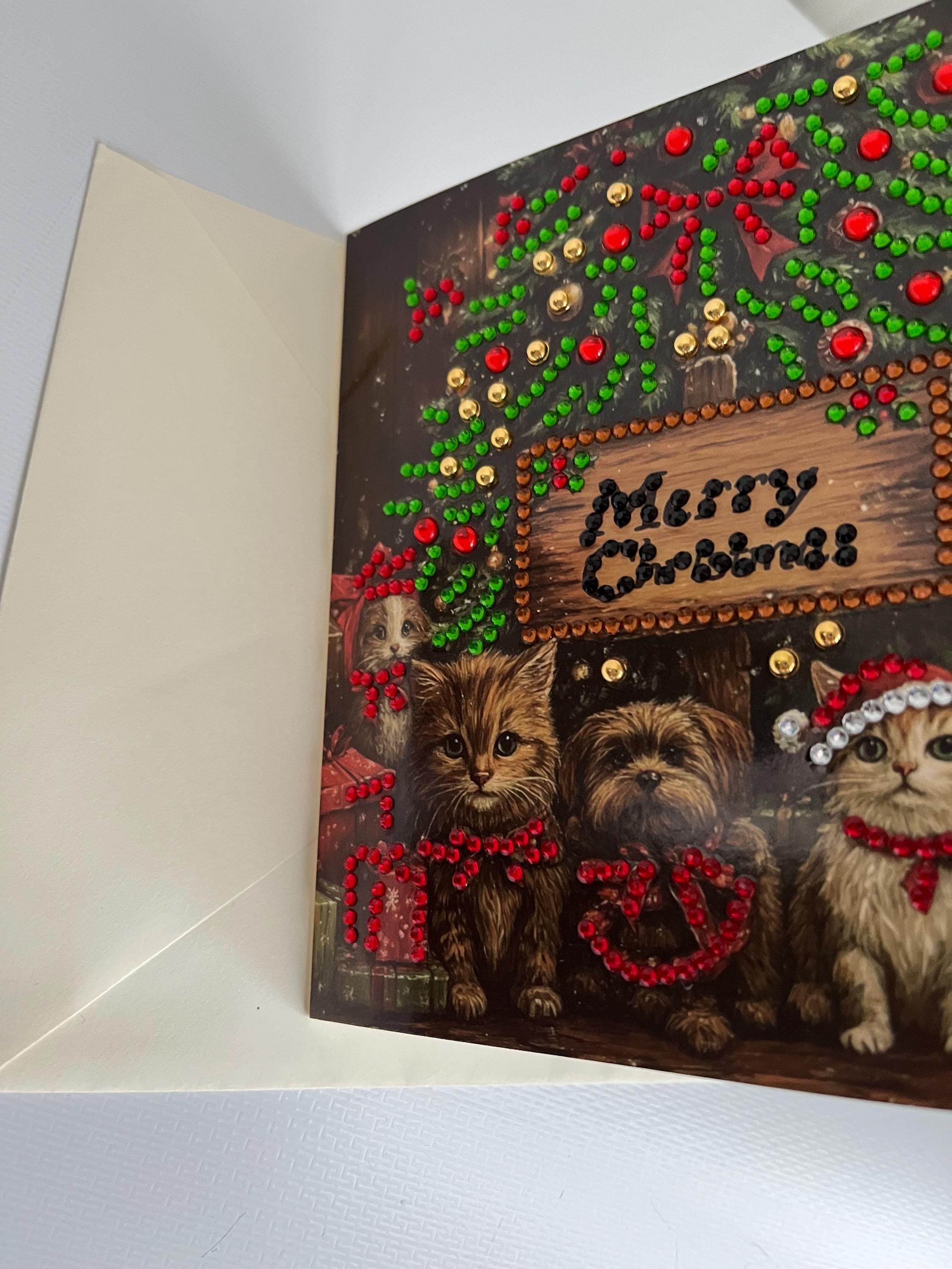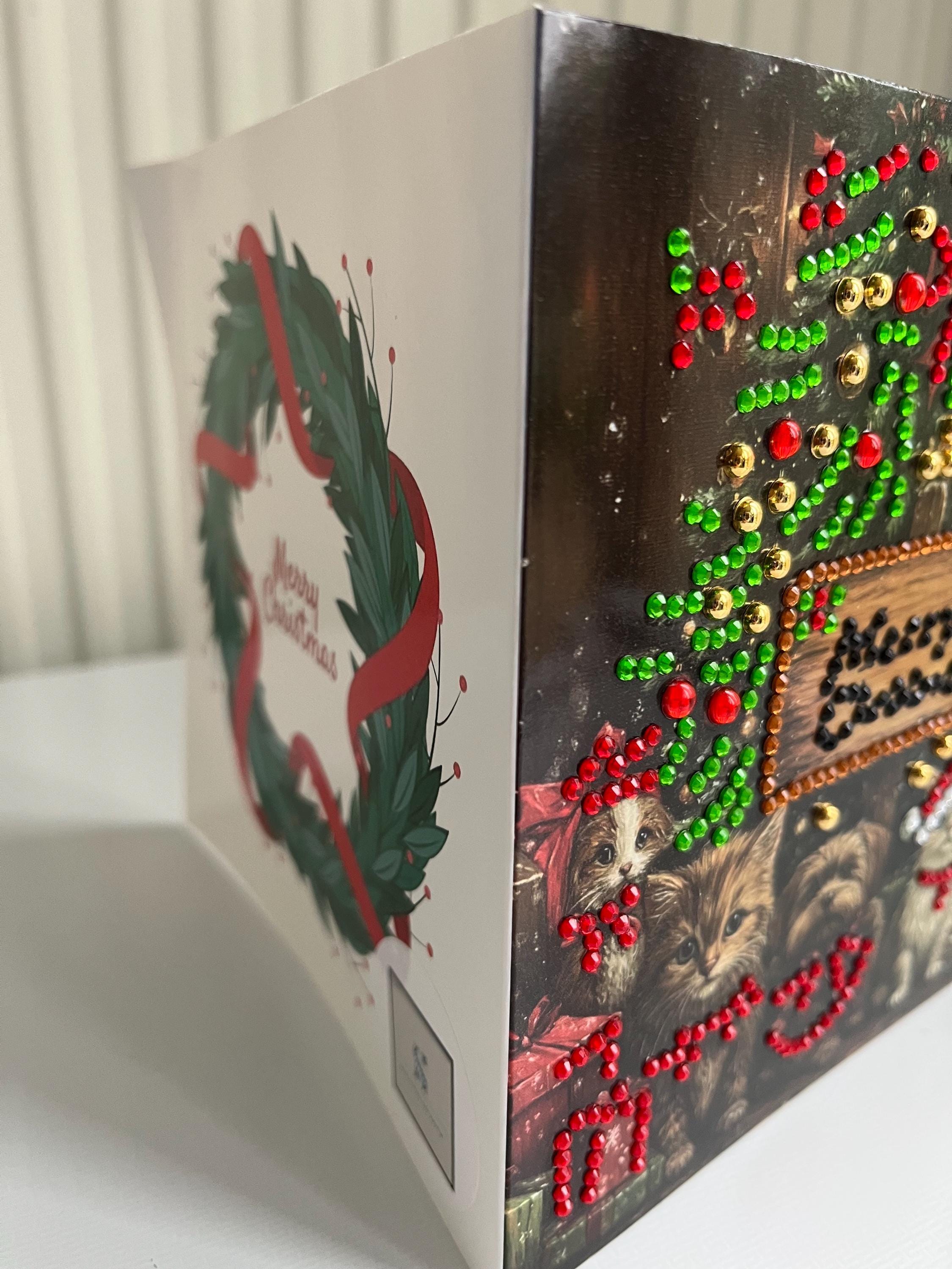 Celebrate the magic of the season with this whimsical, handcrafted crystal card featuring an adorable scene of festive felines! Each card showcases a sparkling Christmas tree surrounded by playful cats wearing tiny Santa hats, brought to life with hand-placed crystals that shimmer in the light.